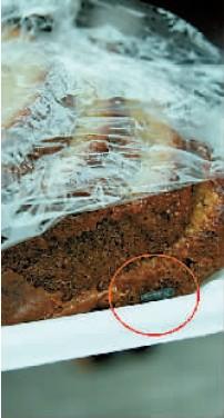 解開保鮮膜,蛋糕一角有顆耗子屎(紅圈處)。