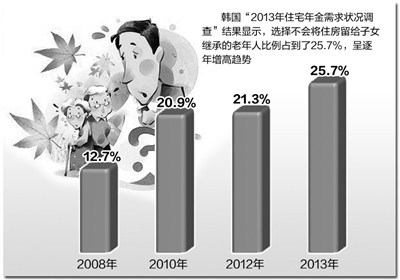 其次是韓國人對待住宅繼承和老年生活觀念的變化。住宅金融公社今年進行的“2013年住宅年金需求狀況調(diào)查”結(jié)果顯示,選擇不會將住房留給子女繼承的老年人比例占到了25.7%。2008年該比重為12.7%,2010年為20.9%,2012年為21.3%,呈逐年增高趨勢。尤其是不滿64歲的老年層占比最高,約達33.5%。在選擇加入住宅年金的理由時,“不希望增加子女負擔”的占87%,“沒有其他養(yǎng)老經(jīng)濟來源”的占85.7%。另外調(diào)查顯示,住宅年金申領(lǐng)者的住宅資產(chǎn)占總資產(chǎn)比為92.8%,而且年齡越高,使用住宅年金的比率越高。住宅年金申領(lǐng)者的月收入中,住宅年金平均占69.4%,70歲以上的住宅年金申領(lǐng)者月收入超過了普通老年階層。據(jù)韓國住宅金融公社的最新數(shù)據(jù),在住宅年金加入條件自8月1日再次放寬之后,8月份申請者增加人數(shù)達到482名,同比增長16.4%。