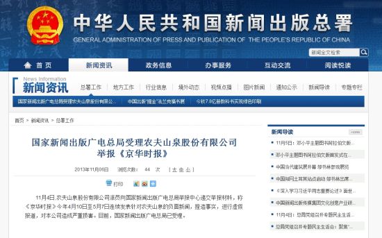 11月4日,農(nóng)夫山泉股份有限公司派員向國(guó)家新聞出版廣電總局舉報(bào)中心遞交舉報(bào)材料,稱《京華時(shí)報(bào)》今年4月10日至5月7日連續(xù)發(fā)表針對(duì)農(nóng)夫山泉的負(fù)面新聞,捏造事實(shí),進(jìn)行虛假報(bào)道,對(duì)該公司造成嚴(yán)重?fù)p害。目前,國(guó)家新聞出版廣電總局已受理。