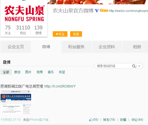 人民網(wǎng)北京11月6日電據(jù)國(guó)家新聞出版總署網(wǎng)站消息,國(guó)家新聞出版廣電總局已受理農(nóng)夫山泉股份有限公司對(duì)《京華時(shí)報(bào)》的舉報(bào)。今日晚間9時(shí)許,農(nóng)夫山泉更新微博表示:感謝新聞出版廣電總局受理。