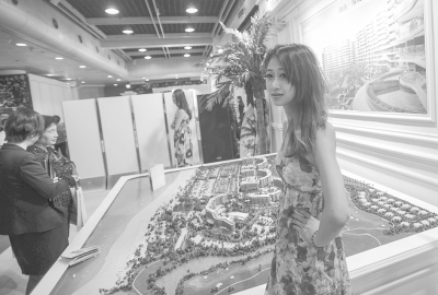 面臨高庫存壓力,此次房博會眾多參展房企為推銷自己的樓盤不惜使出渾身解數。而廣大購房者面對充足的房源選擇,“觀望”居多,下單者少。圖為一家參展房企請來模特在樓盤“擺姿”,以吸引購房者關注!