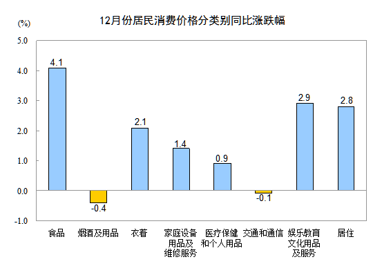 12月份,非食品價(jià)格環(huán)比上漲0.1%。其中,居住、交通和通信、衣著、家庭設(shè)備用品及維修服務(wù)價(jià)格分別上漲0.3%、0.3%、0.1%和0.1%,煙酒及用品、醫(yī)療保健和個(gè)人用品價(jià)格均持平,娛樂教育文化用品及服務(wù)價(jià)格下降0.1%。