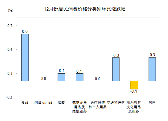 12月份,全國居民消費(fèi)價(jià)格總水平環(huán)比上漲0.3%。其中,城市上漲0.3%,農(nóng)村上漲0.3%;食品價(jià)格上漲0.6%,非食品價(jià)格上漲0.1%;消費(fèi)品價(jià)格上漲0.4%,服務(wù)價(jià)格持平(漲跌幅度為0,下同)。
