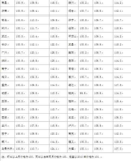 。ㄒ唬┡c上月相比,70個(gè)大中城市中,價(jià)格下降的城市有2個(gè),持平的城市有3個(gè),上漲的城市有65個(gè)。環(huán)比價(jià)格變動(dòng)中,最高漲幅為1.1%,最低為下降1.7%。