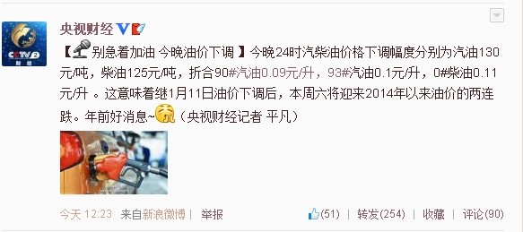 今晚24時(shí)汽柴油價(jià)格下調(diào)幅度分別為汽油130元/噸,柴油125元/噸,折合90#汽油0.09元/升,93#汽油0.1元/升,0#柴油0.11元/升 。這意味著繼1月11日油價(jià)下調(diào)后,本周六將迎來(lái)2014年以來(lái)油價(jià)的兩連跌。(央視財(cái)經(jīng)記者 平凡)