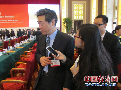 由國務(wù)院發(fā)展研究中心主辦、中國發(fā)展研究基金會承辦的主題為“全面深化改革的中國”的中國發(fā)展高層論壇2014年會于2014年3月22-24日在北京釣魚臺國賓館舉行。中國經(jīng)濟網(wǎng)全程直播報道。圖為中國與世界經(jīng)濟研究中心主任李稻葵接受中國經(jīng)濟網(wǎng)記者采訪。中國經(jīng)濟網(wǎng) 施曉娟 攝影