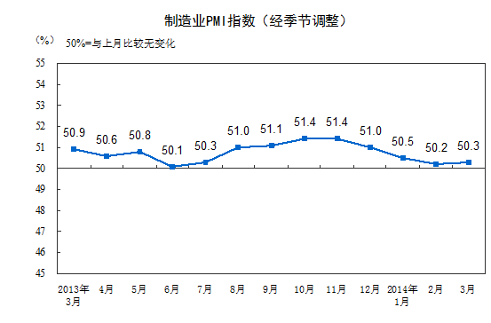 2014年4月1日國家統(tǒng)計(jì)局服務(wù)業(yè)調(diào)查中心和中國物流與采購聯(lián)合會(huì)發(fā)布的中國制造業(yè)采購經(jīng)理指數(shù)顯示,2014年3月中國制造業(yè)PMI為50.3%,比上月微升0.1個(gè)百分點(diǎn),是自去年11月份后首次回升,預(yù)示我國制造業(yè)總體平穩(wěn)向好。