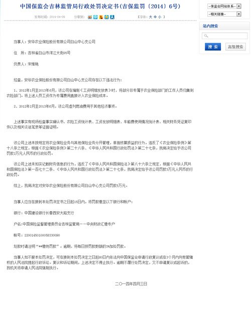 2014年4月9日,吉林保監(jiān)局公布兩則行政處罰決定書。該公告顯示,2012年1月至2013年6月,安華農(nóng)險白山中心支公司在編制《工資明細發(fā)放表》時,將部分非專屬于農(nóng)業(yè)保險部門的工作人員歸集到農(nóng)險部門,將上述人員工資作為專屬費用直接計入農(nóng)業(yè)保險成本。同時該公司還存在虛列燃油費用于其他經(jīng)濟事項的經(jīng)濟行為。吉林保監(jiān)局決定對該公司處以3萬元罰款,直接責任人被警告并罰款5千元。