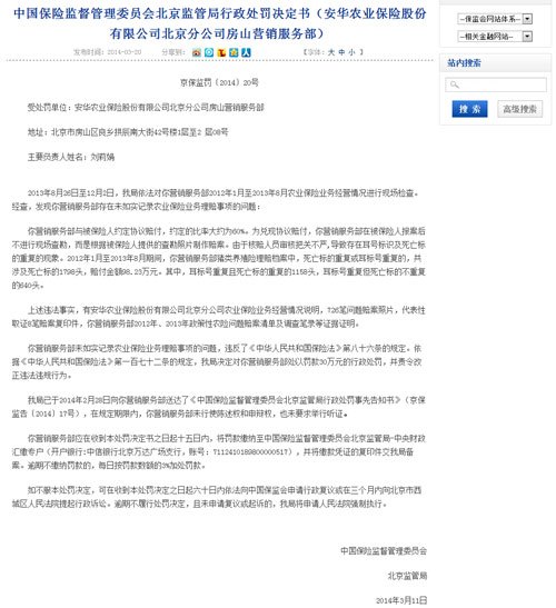 2014年3月20日,北京保監(jiān)局也對該公司進行了處罰。安華農(nóng)險北京分公司房山營銷服務(wù)部在豬類養(yǎng)殖保險業(yè)務(wù)經(jīng)營中與被保險人約定協(xié)議賠付。為兌現(xiàn)協(xié)議賠付,該公司在被保險人報案后不進行現(xiàn)場查勘,而是根據(jù)被保險人提供的查勘照片制作賠案。由于核賠人員審核把關(guān)不嚴,導(dǎo)致存在耳號標識及死亡標的重復(fù)的現(xiàn)象。在2012年1月至2013年8月期間,安華農(nóng)險北京分公司房山營銷服務(wù)部豬類養(yǎng)殖保險理賠檔案中,死亡標的重復(fù)或耳標號重復(fù)的,共涉及死亡標的1798頭,賠付金額98.23萬元。其中,耳標號重復(fù)且死亡標的重復(fù)的1158頭,耳標號重復(fù)但死亡標的不重復(fù)的640頭。對此,北京保監(jiān)局對安華農(nóng)險北京分公司房山營銷服務(wù)部處以罰款30萬元的行政處罰,并責令改正違法違規(guī)行為,直接責任人被處以警告和3萬元的行政罰款。
