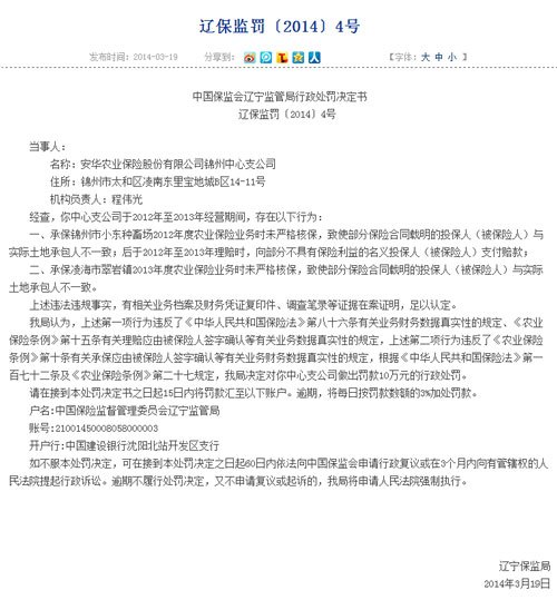 在2014年3月19日,遼寧保監(jiān)局也針對該公司的農(nóng)險業(yè)務(wù)開出行政罰單。遼寧保監(jiān)局調(diào)查發(fā)現(xiàn),安華農(nóng)險錦州中心支公司承保錦州市小東種畜場2012年度農(nóng)業(yè)保險業(yè)務(wù)時未嚴格核保,致使部分保險合同載明的投保人(被保險人)與實際土地承包人不一致;后于2012年至2013年理賠時,向部分不具有保險利益的名義投保人支付賠款。此外,該公司承保凌海市翠巖鎮(zhèn)2013年度農(nóng)業(yè)保險業(yè)務(wù)時未嚴格核保,致使部分保險合同載明的投保人與實際土地承包人不一致。由于上述違法違規(guī)行為,安華農(nóng)險錦州中心支公司受到遼寧保監(jiān)局罰款10萬元處罰,負有直接責任的該公司時任總經(jīng)理被撤銷任職資格。