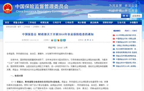據(jù)保監(jiān)會(huì)、財(cái)政部于2014年4月15日下發(fā)的關(guān)于開展2014年農(nóng)業(yè)保險(xiǎn)檢查的通知稱,為進(jìn)一步規(guī)范市場(chǎng)行為,完善農(nóng)業(yè)保險(xiǎn)制度,推動(dòng)農(nóng)業(yè)保險(xiǎn)持續(xù)健康發(fā)展,保監(jiān)會(huì)、財(cái)政部將于2014年4月—6月對(duì)農(nóng)業(yè)保險(xiǎn)經(jīng)營(yíng)情況開展聯(lián)合檢查,檢查重點(diǎn)為2013年度農(nóng)業(yè)保險(xiǎn)業(yè)務(wù)經(jīng)營(yíng)狀況包括經(jīng)營(yíng)行為的合規(guī)性、內(nèi)控管理的有效性、農(nóng)業(yè)保險(xiǎn)發(fā)展情況評(píng)估等。