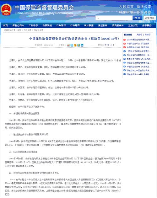 其實(shí),早在2009年保監(jiān)會(huì)就對(duì)安華農(nóng)險(xiǎn)進(jìn)行一次大調(diào)查。在那次調(diào)查中,保監(jiān)會(huì)指出安華農(nóng)險(xiǎn)有11種問(wèn)題,包括:未經(jīng)批準(zhǔn)投資股票,且造成嚴(yán)重?fù)p失;財(cái)務(wù)數(shù)據(jù)和償付能力報(bào)告不真實(shí);違規(guī)投資設(shè)立保險(xiǎn)業(yè)以外的企業(yè);未經(jīng)核準(zhǔn)推舉董事履行董事長(zhǎng)職責(zé);向保監(jiān)會(huì)報(bào)送虛假報(bào)告、文件和資料;以關(guān)聯(lián)借款違規(guī)運(yùn)用資金;費(fèi)用支出不真實(shí),存在虛假發(fā)票報(bào)銷問(wèn)題;虛增實(shí)收資本;重大事項(xiàng)未按規(guī)定向保監(jiān)會(huì)報(bào)告;法人治理缺失;業(yè)務(wù)管理不規(guī)范。