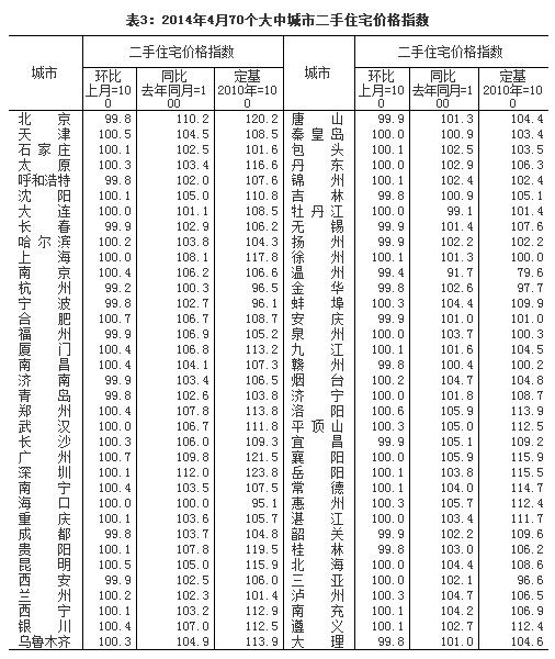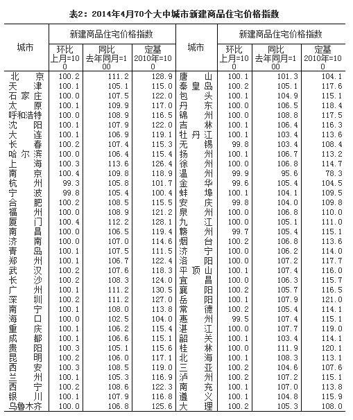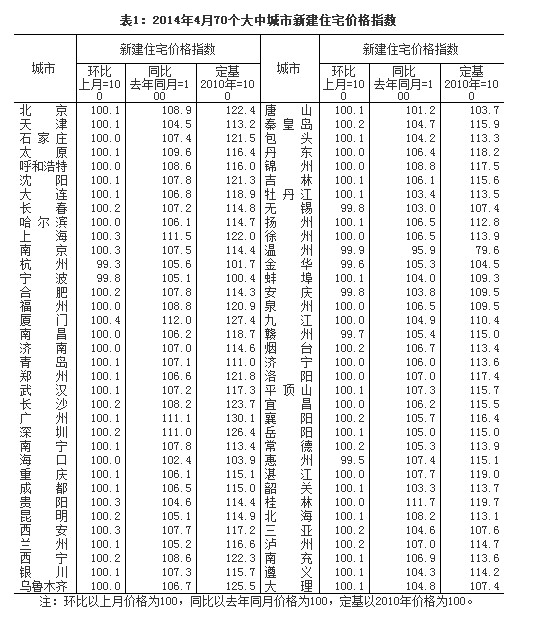 表1:2014年4月70個(gè)大中城市新建住宅價(jià)格指數(shù)