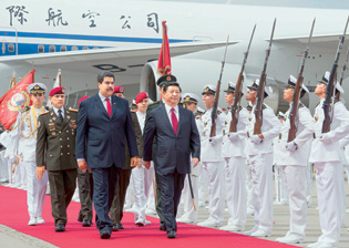 馬杜羅在機(jī)場為習(xí)近平舉行隆重歡迎儀式。兩國元首登上檢閱臺。軍樂團(tuán)奏委中兩國國歌,升中國國旗。習(xí)近平在馬杜羅陪同下檢閱儀仗隊(duì)。