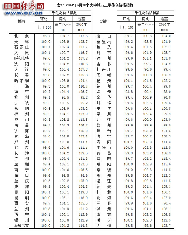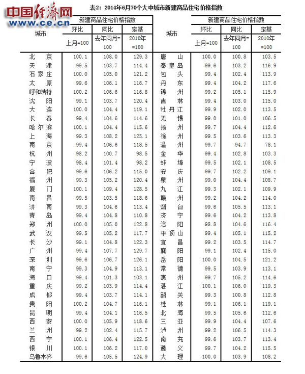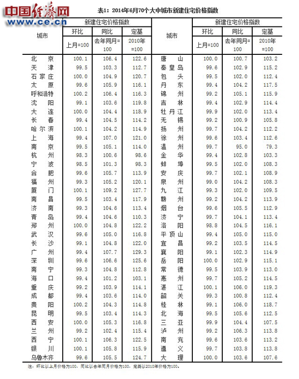中國經(jīng)濟網(wǎng)北京7月18日訊 國家統(tǒng)計局18日發(fā)布的2014年6月70個大中城市住宅銷售價格月度報告顯示,與上月相比,70個大中城市中,價格下降的城市有55個,持平的城市有7個,上漲的城市有8個;與去年同月相比,價格下降的城市有1個,上漲的城市有69個