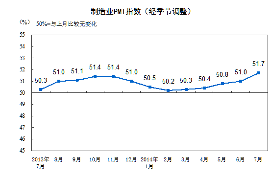 2014年7月,中國制造業(yè)采購經理指數(shù)(PMI)為51.7%,比上月上升0.7個百分點,連續(xù)5個月回升,表明我國制造業(yè)穩(wěn)中向好的趨勢更加明顯。