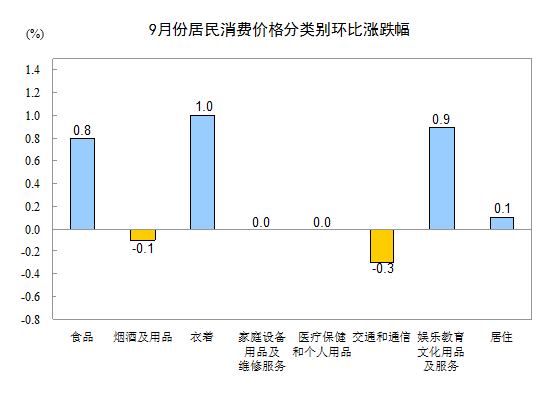 9月份,非食品價格環(huán)比上漲0.3%。其中,衣著、娛樂教育文化用品及服務(wù)、居住價格分別上漲1.0%、0.9%和0.1%;家庭設(shè)備用品及維修服務(wù)、醫(yī)療保健和個人用品價格持平(漲跌幅度為0);交通和通信、煙酒及用品價格分別下降0.3%和0.1%。