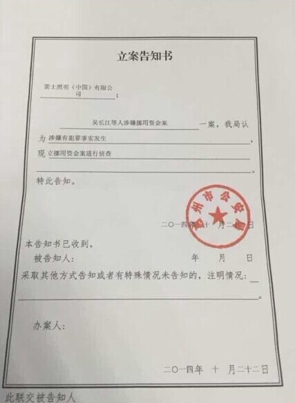 雷士照明官方微博于10月28日發(fā)布落款為惠州市公安局的“立案告知書”,顯示惠州市公安局已正式對雷士照明吳長江等人挪用資金立案,認(rèn)為涉嫌有犯罪事實(shí)發(fā)生,現(xiàn)就挪用資金案進(jìn)行偵查。