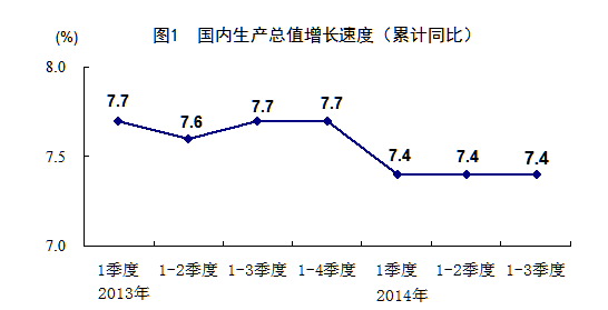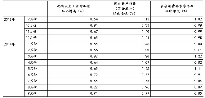 2013年各季度及2014年一、二、三季度GDP環(huán)比增速分別為1.6%、1.8%、2.3%、1.7%、1.5%、2.0%和1.9%。