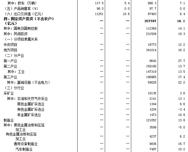 前三季度,固定資產(chǎn)投資(不含農(nóng)戶)357787億元,同比名義增長(zhǎng)16.1%(扣除價(jià)格因素實(shí)際增長(zhǎng)15.3%),增速比上半年回落1.2個(gè)百分點(diǎn)。其中,國(guó)有及國(guó)有控股投資112369億元,增長(zhǎng)14.1%;民間投資231509億元,增長(zhǎng)18.3%,占全部投資的比重為64.7%。分地區(qū)看,東部地區(qū)投資同比增長(zhǎng)14.9%,中部地區(qū)增長(zhǎng)17.8%,西部地區(qū)增長(zhǎng)17.9%。分產(chǎn)業(yè)看,第一產(chǎn)業(yè)投資8642億元,同比增長(zhǎng)27.7%;第二產(chǎn)業(yè)投資150180億元,增長(zhǎng)13.7%;第三產(chǎn)業(yè)投資198965億元,增長(zhǎng)17.4%。從到位資金情況看,前三季度到位資金391141億元,同比增長(zhǎng)12.4%。其中,國(guó)家預(yù)算資金增長(zhǎng)14.1%,國(guó)內(nèi)貸款增長(zhǎng)11.2%,自籌資金增長(zhǎng)16.1%,利用外資下降7.0%。前三季度新開工項(xiàng)目計(jì)劃總投資303729億元,同比增長(zhǎng)14.4%。從環(huán)比看,9月份固定資產(chǎn)投資(不含農(nóng)戶)增長(zhǎng)0.77%。