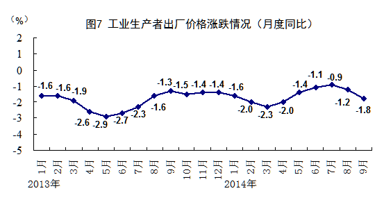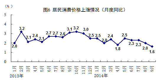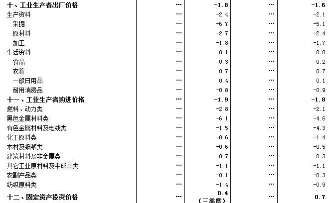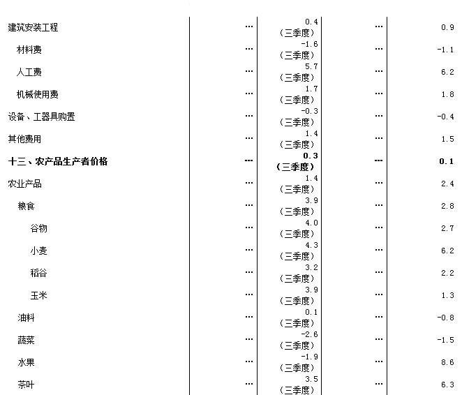 前三季度,居民消費(fèi)價(jià)格同比上漲2.1%,漲幅比上半年回落0.2個(gè)百分點(diǎn)。其中,城市上漲2.2%,農(nóng)村上漲1.9%。分類別看,食品價(jià)格同比上漲3.3%,煙酒及用品下降0.6%,衣著上漲2.4%,家庭設(shè)備用品及維修服務(wù)上漲1.2%,醫(yī)療保健和個(gè)人用品上漲1.2%,交通和通信上漲0.1%,娛樂教育文化用品及服務(wù)上漲2.2%,居住上漲2.3%。在食品價(jià)格中,糧食價(jià)格上漲3.1%,油脂價(jià)格下降5.0%,豬肉價(jià)格下降4.5%,鮮菜價(jià)格下降1.3%。9月份,居民消費(fèi)價(jià)格同比上漲1.6%,環(huán)比上漲0.5%。前三季度,工業(yè)生產(chǎn)者出廠價(jià)格同比下降1.6%,9月份同比下降1.8%,環(huán)比下降0.4%。前三季度,工業(yè)生產(chǎn)者購進(jìn)價(jià)格同比下降1.8%,9月份同比下降1.9%,環(huán)比下降0.4%。