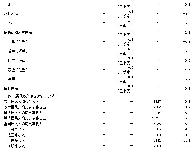 前三季度,全國(guó)農(nóng)村居民人均現(xiàn)金收入8527元,同比名義增長(zhǎng)11.8%,扣除價(jià)格因素實(shí)際增長(zhǎng)9.7%。全國(guó)城鎮(zhèn)居民人均可支配收入22044元,同比名義增長(zhǎng)9.3%,扣除價(jià)格因素實(shí)際增長(zhǎng)6.9%。根據(jù)城鄉(xiāng)一體化住戶調(diào)查,前三季度全國(guó)居民人均可支配收入14986元,同比名義增長(zhǎng)10.5%,扣除價(jià)格因素實(shí)際增長(zhǎng)8.2%。全國(guó)居民人均可支配收入中位數(shù)13120元,同比名義增長(zhǎng)12.1%。9月末,農(nóng)村外出務(wù)工勞動(dòng)力17561萬人,同比增加169萬人,增長(zhǎng)1.0%。外出務(wù)工勞動(dòng)力月均收入2797元,增長(zhǎng)10.0%。