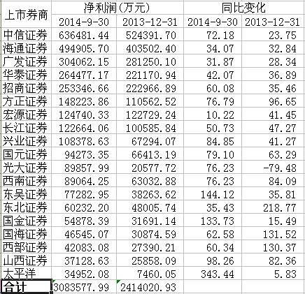 19家上市券商2014年三季報及2013年凈利情況