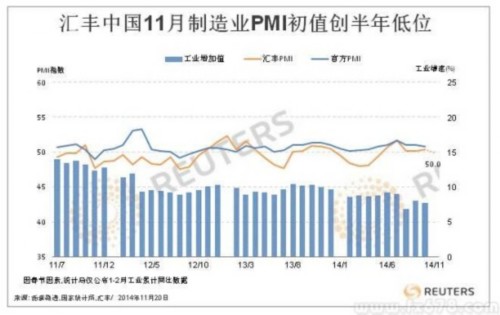 匯豐(HSBC)/Markit周四(11月20日)聯(lián)合公布“匯豐中國制造業(yè)采購經(jīng)理人指數(shù)(PMI)預(yù)覽”,11月PMI初值降至50,創(chuàng)六個月(5月以來)最低水準(zhǔn),預(yù)期微降至50.2,上月終值為50.4。