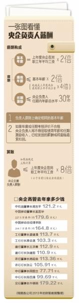 中央管理企業(yè)負(fù)責(zé)人薪酬制度改革將于2015年年初開始實(shí)施,改革首批將涉及中石油、中石化、中移動等72家央企的負(fù)責(zé)人。據(jù)介紹,未來央企負(fù)責(zé)人薪酬將由基本年薪、績效年薪、任期激勵收入三部分構(gòu)成,將不超過央企在崗職工平均工資的7到8倍,與現(xiàn)行政策相比,改革后多數(shù)負(fù)責(zé)人的薪酬水平將會下降。