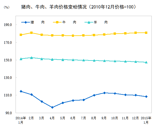 國家統(tǒng)計局數(shù)據(jù)顯示,2014年12月份CPI同比上漲1.5%。據(jù)商務部監(jiān)測,進入2015年1月份以來,全國36個大中城市食用農(nóng)產(chǎn)品市場價格總體略有上漲,其中,18種蔬菜平均價格小幅上漲,但豬肉等肉類價格一路走低。