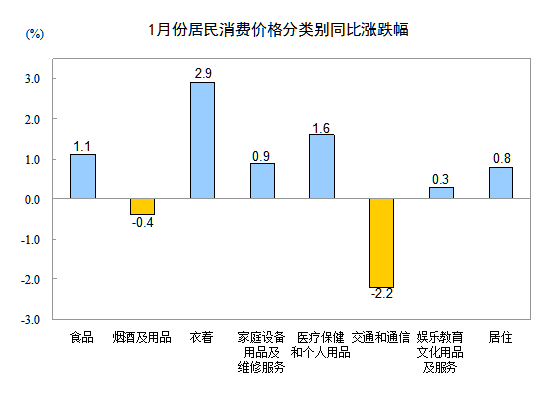 1月份,非食品價格同比上漲0.6%。其中,衣著、醫(yī)療保健和個人用品、家庭設備用品及維修服務、居住、娛樂教育文化用品及服務價格分別上漲2.9%、1.6%、0.9%、0.8%和0.3%;交通和通信、煙酒及用品價格分別下降2.2%和0.4%。