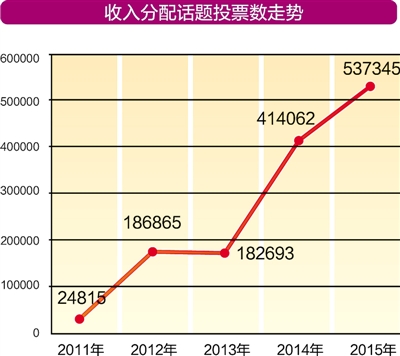 收入分配話題居民眾關(guān)心首位:“收入分配”話題連續(xù)5年排名靠前,2015年收入分配排名第一,投票數(shù)上升至53萬,再創(chuàng)新高。在深化改革大背景下,民眾對收入分配話題給予更多關(guān)注,一方面是希望得到更多的改革紅利,另一方面也寄托了期望公正、平等的情感。