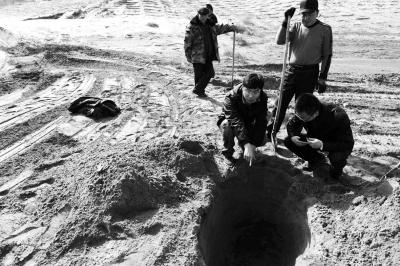 環(huán)保專家組成員在甘肅武威境內(nèi)的騰格里沙漠受污染地點(diǎn)深挖探坑調(diào)查取樣。
