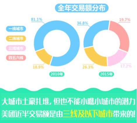 從該報告中,我們看到中國O2O市場呈現(xiàn)兩大特征。首先,三四線市場加速崛起。在2010年,美團(tuán)網(wǎng)一線城市的交易額占比為81.1%,二線城市交易額占比為18.9%。隨著美團(tuán)網(wǎng)在中小城市的快速下沉及擴(kuò)張,一線城市交易額的占比下降到36.8%,而二線以下城市的交易額占比已經(jīng)達(dá)到63.2%,市場潛力不可小覷。