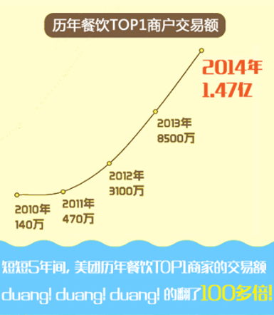 其次,商戶交易額在O2O平臺上迅速做大。餐飲是本地生活服務(wù)最重要的品類之一。2010年,美團(tuán)網(wǎng)餐飲TOP1商家年交易額為140萬,而到了2014年,TOP1商家年交易額已經(jīng)達(dá)到了1.47億元,實現(xiàn)百倍增長。美團(tuán)網(wǎng)餐飲品類交易額前三甲分別為漢麗軒、黃記煌、澳門豆撈。其中漢麗軒從2012年起已蟬聯(lián)美團(tuán)餐飲品類銷冠三年。