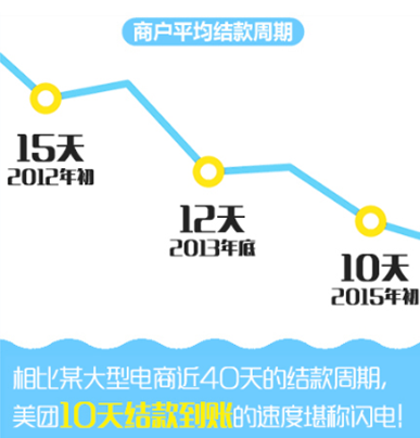在報告中,我們可以看到,美團(tuán)網(wǎng)一直在持續(xù)改進(jìn)和優(yōu)化對商戶的服務(wù)。商家結(jié)款周期就是一個典型的例子。美團(tuán)網(wǎng)采用自主研發(fā)的自動結(jié)款系統(tǒng),結(jié)款準(zhǔn)確迅速,平均結(jié)款周期被壓縮到10天,讓商家的資金可以快速回流,這在很大程度上緩解了商戶的資金壓力。