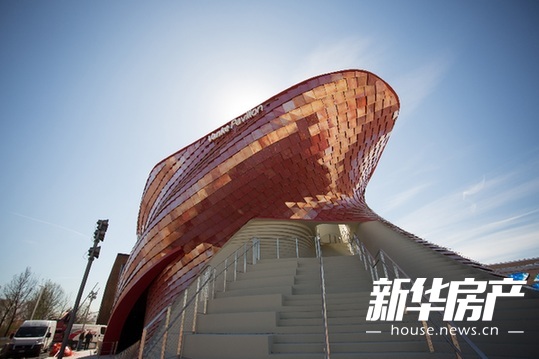 萬科館由國際著名建筑師、紐約世貿(mào)中心重建總規(guī)劃師丹尼爾 里伯斯金設計,理念出自中國傳統(tǒng)山水畫以及梯田這一農(nóng)業(yè)符號,外部4000塊紅色陶板在陽光照射下仿佛鱗片,整個建筑似盤龍一般,蘊含了農(nóng)耕社會祈求風調(diào)雨順、豐衣足食的寓意。