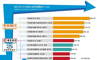 不過,2014年銀行高管薪酬總體微漲,而且股份制銀行之間高管薪酬差距明顯。在16家上市銀行中,干滿一年的董事長(zhǎng)、行長(zhǎng)中,薪酬最高的年薪835.27萬元,最低的100.76萬元,相差7倍。