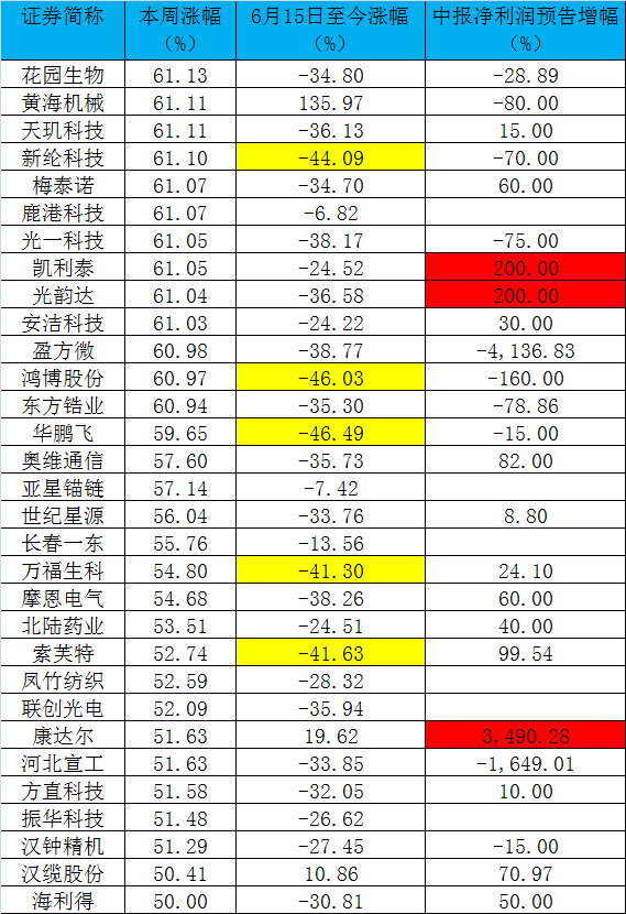 統(tǒng)計(jì)數(shù)據(jù)顯示,本周A股共2058只個(gè)股上漲,169只個(gè)股超過(guò)30%,漲幅超過(guò)20%的個(gè)股也有400只。剔除年內(nèi)上市的公司,部分本周漲幅靠前個(gè)股跌幅仍較大,后市值得重點(diǎn)關(guān)注。