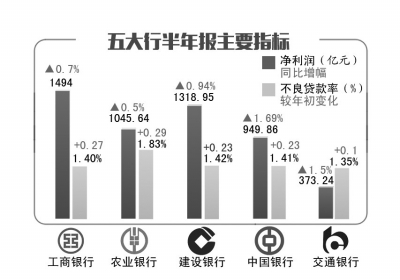 中報(bào)顯示,上半年,工行實(shí)現(xiàn)凈利潤(rùn)1494億元,同比增長(zhǎng)0.7%;建行實(shí)現(xiàn)凈利潤(rùn)1318.95億元,同比增長(zhǎng)0.94%;中行實(shí)現(xiàn)凈利潤(rùn)949.86億元,同比增長(zhǎng)1.69%,是五大行中凈利潤(rùn)增速最高的一家;農(nóng)行實(shí)現(xiàn)凈利潤(rùn)1045.64億元,同比增長(zhǎng)0.5%,在五大行中增速最慢,且下滑最快。此外,交行實(shí)現(xiàn)凈利潤(rùn)373.24億元,同比增長(zhǎng)1.5%。