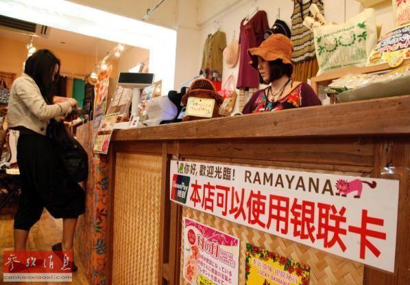 日本沖繩一家商場為吸引中國游客購物,貼出可以使用銀聯(lián)卡消費的標識。(資料圖片)