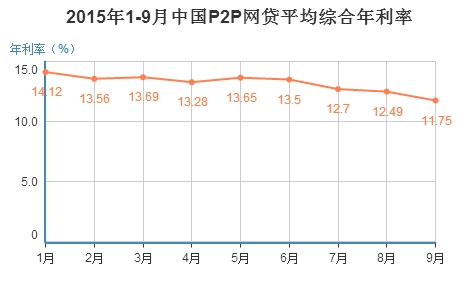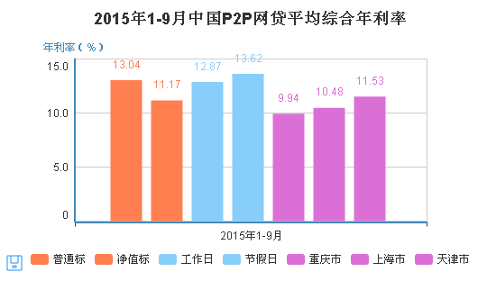 2015年1-9月,全國(guó)P2P網(wǎng)貸平均合年利率:普通標(biāo)13.04%、凈值標(biāo)11.17%;法定工作日12.87%,節(jié)假日、雙休日13.62%。
