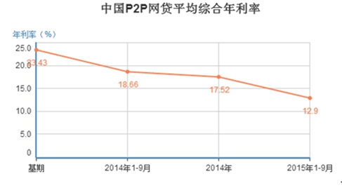 2015年1-9月,全國(guó)P2P網(wǎng)貸利率12.90%,同比(較2014年1-9月18.66%)降低5.76個(gè)百分點(diǎn);較基期23.43%,降低10.53個(gè)百分點(diǎn)。