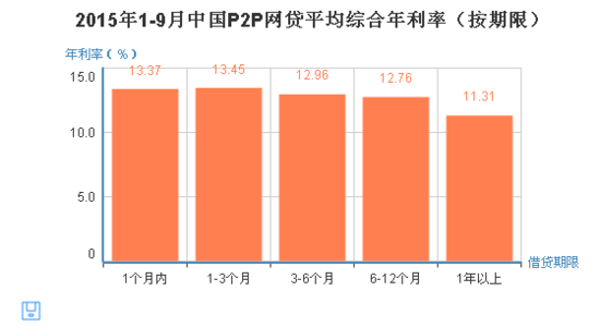 2015年1-9月,P2P網(wǎng)貸期限1個(gè)月內(nèi),全國(guó)平均綜合年利率為13.37%;1-3個(gè)月,13.45%;3-6個(gè)月,12.96%;6個(gè)月-1年,12.76%;1年以上,11.31%。