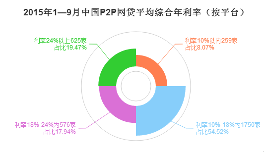 2015年1-9月,納入中國(guó)P2P網(wǎng)貸指數(shù)樣本平臺(tái)中,8.07%的平臺(tái),平均綜合年利率在10%以下;54.52%的平臺(tái),平均綜合年利率在10%-18%間;17.94%的平臺(tái),平均綜合年利率在18%-24%之間;19.47的平臺(tái),平均綜合年利率在24%以上。