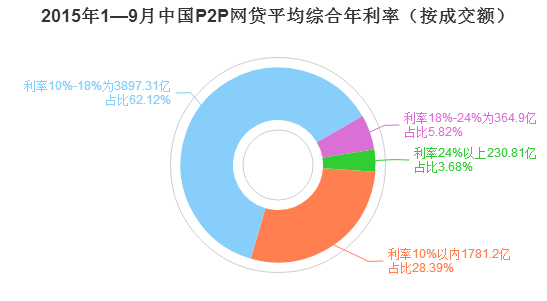 2015年1-9月,全國(guó)P2P網(wǎng)貸總成交額的28.39%,年利率在10%以內(nèi),媲美銀行;62.12%,年利率10%-18%;5.82%,年利率18%-24%;3.68%,年利率24%以上。