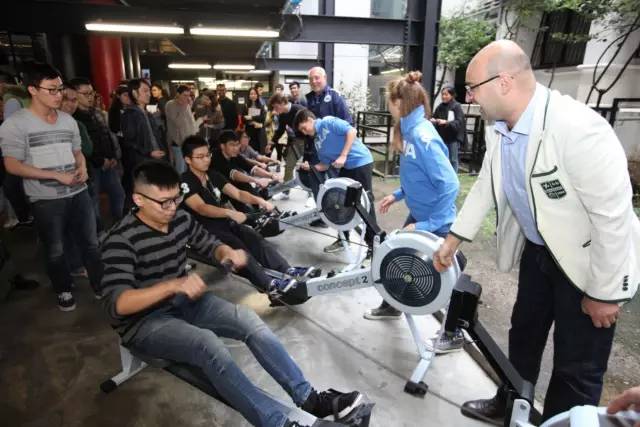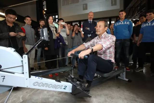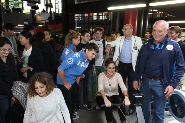 米理的Patio Architettura大廳旁放置了四臺賽艇用測功儀,來自意大利賽艇協(xié)會的專業(yè)運動員們邀請到場的同學(xué)們體驗,并予以指導(dǎo)。每位“劃艇”達到200米并且被教練認可為標準的同學(xué)都獲得了萬科館紀念圖冊Moving Focus一本。