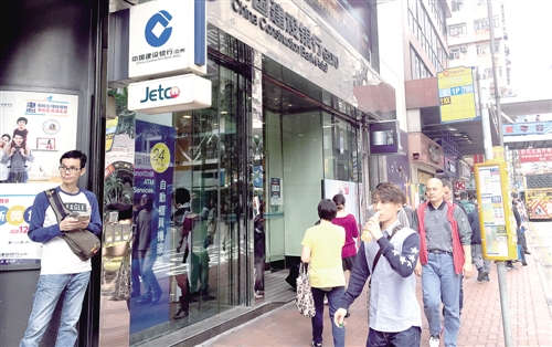 香港是國(guó)際金融中心,全球很多金融機(jī)構(gòu)都會(huì)在香港設(shè)立分支機(jī)構(gòu)。因此,香港街頭金融機(jī)構(gòu)的密集度非常高。圖為行人從位于香港軒尼詩(shī)道的中國(guó)建設(shè)銀行分理處門前走過(guò)。