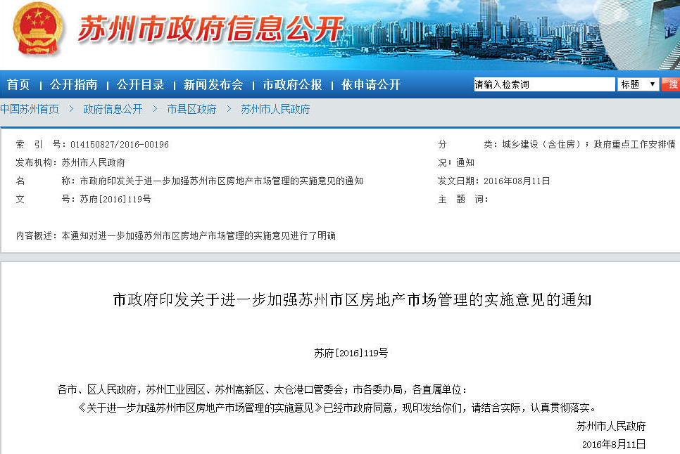 央廣網8月11日消息 今天下午,蘇州市政府正式印發(fā)《關于進一步加強蘇州市區(qū)房地產市場管理的實施意見》,從土地供應、土地競價、預售管理、價格管理、戶籍居民信貸、非戶籍居民信貸等15個方面對蘇州房地產市場進行新的部署和要求,該意見自明日起實施。意見全文內容如下: