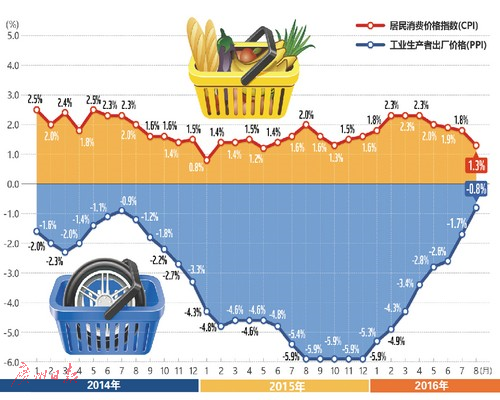 國家統(tǒng)計局剛剛發(fā)布的2016年8月份全國居民消費價格指數(shù)(CPI)和工業(yè)生產(chǎn)者出廠價格指數(shù)(PPI)數(shù)據(jù)顯示,CPI環(huán)比上漲0.1%,同比上漲1.3%;PPI環(huán)比上漲0.2%,同比下降0.8%。